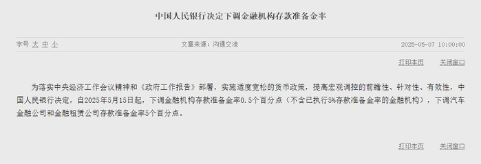 中新网5月7日电 据中国人民银行网站消息,为落实中央经济工作会议精神和《政府工作报告》部署,实施适度宽松的货币政策,提高宏观调控的前瞻性、针对性、有效性,中国人民银行决定,自2025年5月15日起,下调金融机构存款准备金率0.5个百分点(不含已执行5%存款准备金率的金融机构),下调汽车金融公司和金融租赁公司存款准备金率5个百分点。