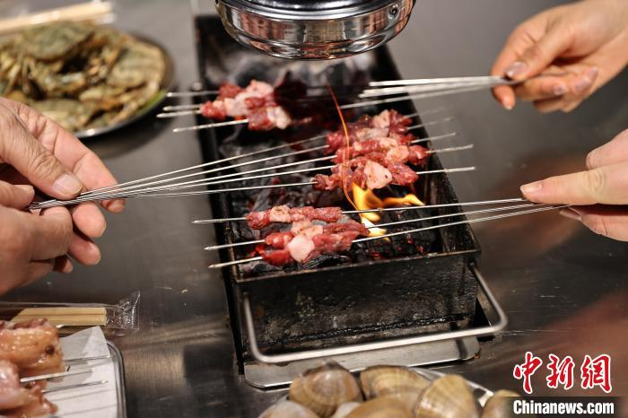图为工作人员在穿肉串。中新社记者 于海洋 摄