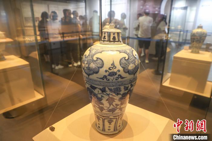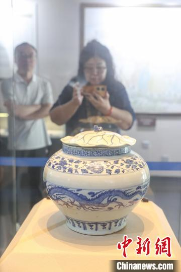 5月11日,江西宜春高安市,游客在元青花博物馆内参观展出的元青花云龙纹荷叶盖罐。元青花瓷(又称元青花),即元代生产的青花瓷器。高安元青花博物馆是世界上第一座以元青花命名的专题性博物馆,这里珍藏了20件元代青花瓷器和4件釉里红瓷器。这些瓷器器物完整、器型硕大、品种较全、造型优美、工艺精湛,属罕见元代极品。目前,该馆馆藏元代青花瓷器数量中国第一、世界第三。中新社记者 刘力鑫 摄