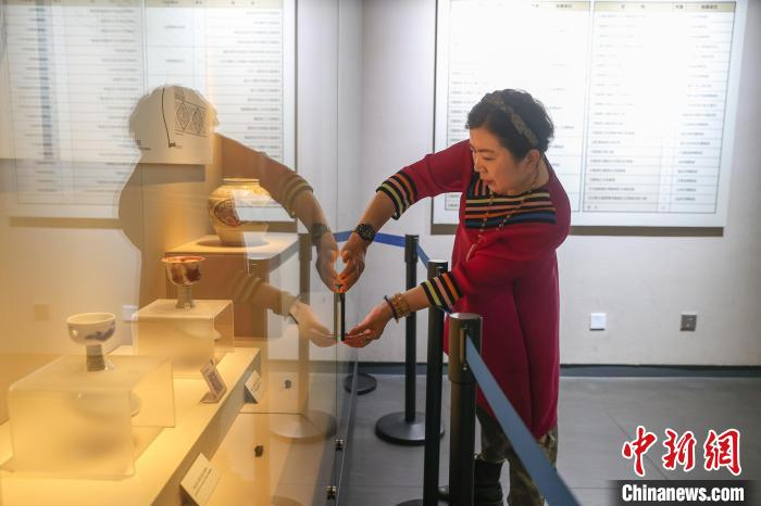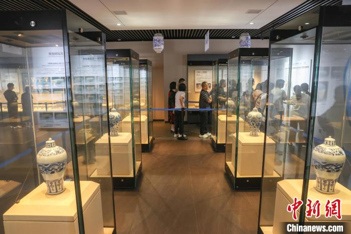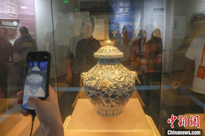 5月11日,江西宜春高安市,游客在元青花博物馆内拍摄展出的各类元青花瓷器文物。元青花瓷(又称元青花),即元代生产的青花瓷器。高安元青花博物馆是世界上第一座以元青花命名的专题性博物馆,这里珍藏了20件元代青花瓷器和4件釉里红瓷器。这些瓷器器物完整、器型硕大、品种较全、造型优美、工艺精湛,属罕见元代极品。目前,该馆馆藏元代青花瓷器数量中国第一、世界第三。中新社记者 刘力鑫 摄
