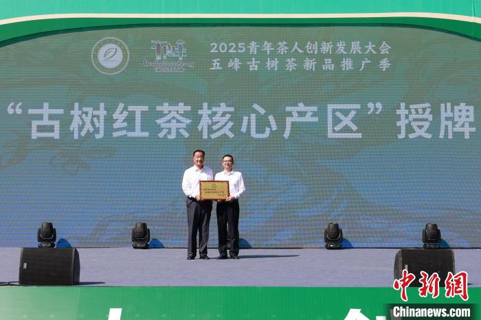 中国茶叶流通协会授牌五峰“古树红茶核心产区”。董晓斌 摄宜昌市副市长汤明表示,该市将以“大企业、大品牌、大市场”为方向,全力支持青年创业、企业创新、产业创优,希望青年茶人在品种培育、数字茶园、品牌营销等领域大胆突破,让千年茶韵焕发时代光彩。(完)