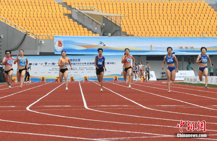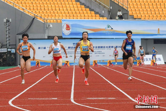 5月14日,第三届“一带一路”田径邀请赛暨2025年全国田径大奖赛(第3站)在重庆长寿开赛。据悉,经世界田径联合会认证,本届赛事从铜级赛事正式升格为银级赛事,吸引共建“一带一路”国家的田径选手们参赛,总参赛规模达1200余人。该赛事以“交流开放、融合发展”为核心理念,依托“一带一路”深化国际体育合作,全面提升赛事品质与观赛体验。图为女子100米项目预赛现场,中国选手葛曼棋(黄衣)以11.58秒的成绩晋级复赛。中新社记者 周毅 摄