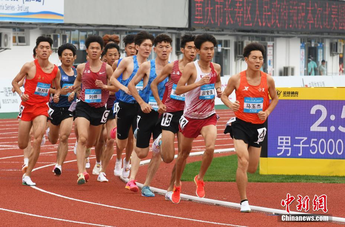 5月14日,第三届“一带一路”田径邀请赛暨2025年全国田径大奖赛(第3站)在重庆长寿开赛。据悉,经世界田径联合会认证,本届赛事从铜级赛事正式升格为银级赛事,吸引共建“一带一路”国家的田径选手们参赛,总参赛规模达1200余人。该赛事以“交流开放、融合发展”为核心理念,依托“一带一路”深化国际体育合作,全面提升赛事品质与观赛体验。图为男子5000米项目决赛现场,参赛选手展开激烈角逐。中新社记者 周毅 摄