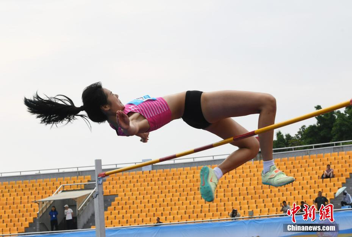 5月14日,第三届“一带一路”田径邀请赛暨2025年全国田径大奖赛(第3站)在重庆长寿开赛。据悉,经世界田径联合会认证,本届赛事从铜级赛事正式升格为银级赛事,吸引共建“一带一路”国家的田径选手们参赛,总参赛规模达1200余人。该赛事以“交流开放、融合发展”为核心理念,依托“一带一路”深化国际体育合作,全面提升赛事品质与观赛体验。图为比赛现场,中国选手李沅荧参加女子跳高项目决赛。中新社记者 周毅 摄