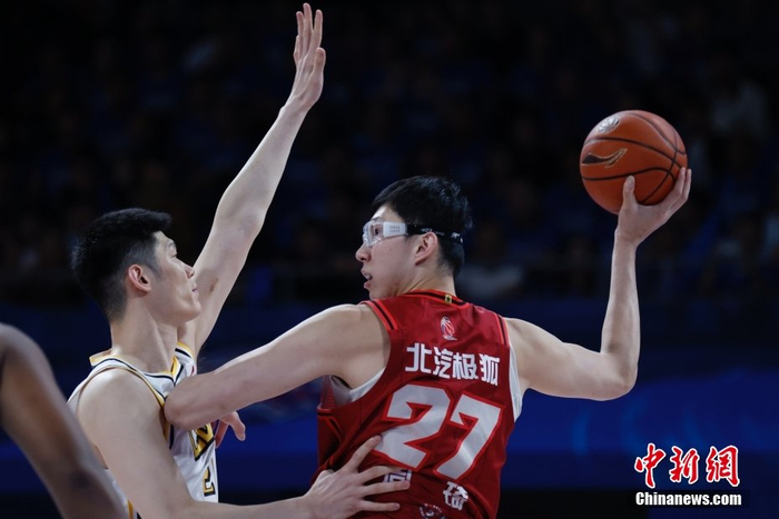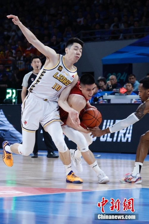 5月14日,在北京首都体育馆举行的2024-2025中国男子篮球职业联赛(CBA)总决赛第四场比赛中,北京北汽队主场73比106不敌浙江方兴渡队。图为北京北汽队周琦(红衣)在比赛中持球。中新社记者 韩海丹 摄