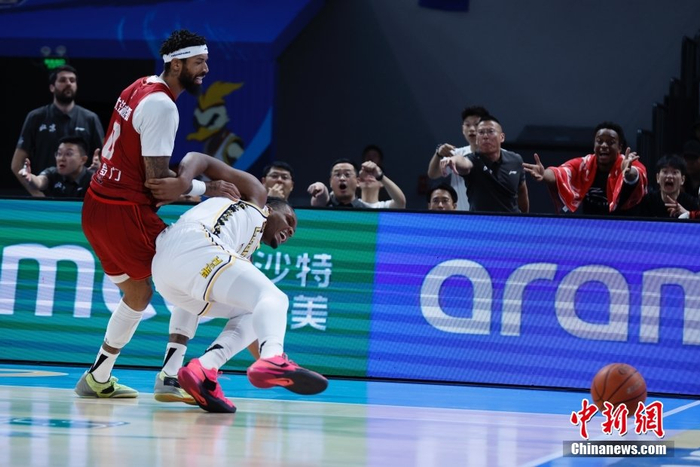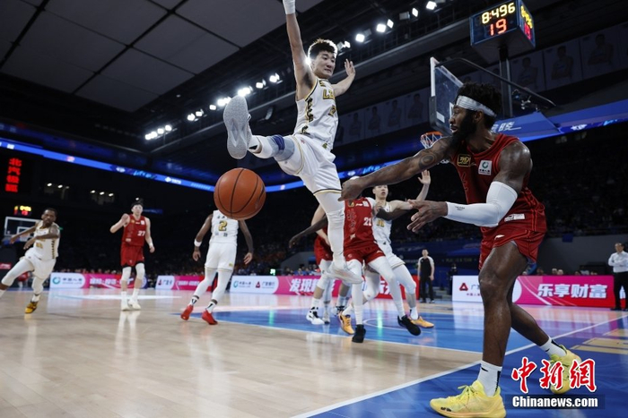 5月14日,在北京首都体育馆举行的2024-2025中国男子篮球职业联赛(CBA)总决赛第四场比赛中,北京北汽队主场73比106不敌浙江方兴渡队。图为北京北汽队杰曼(红衣)在比赛中发球。中新社记者 韩海丹 摄