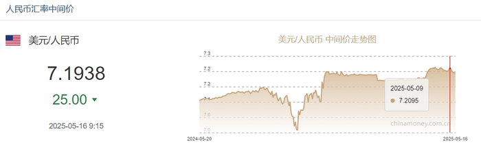 中新网5月16日电 据中国外汇交易中心网站消息,中国人民银行授权中国外汇交易中心公布,2025年5月16日银行间外汇市场人民币汇率中间价为:1美元对人民币7.1938元,上调25个基点。