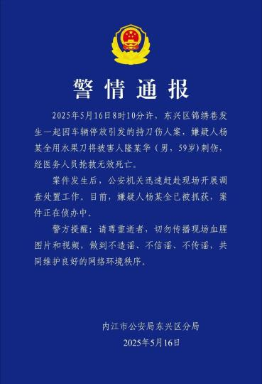 中新网成都5月16日电(王爵)16日,四川省内江市公安局东兴区分局发布警情通报称,5月16日8时10分许,东兴区锦绣巷发生一起因车辆停放引发的持刀伤人案,嫌疑人杨某全用水果刀将被害人隆某华(男,59岁)刺伤,经医务人员抢救无效死亡。