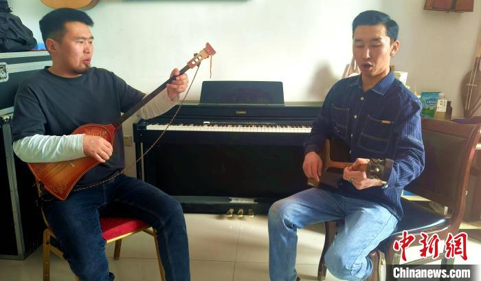 呼麦演员阿力同桑(右)和同事交流呼麦弹唱技法。和静县融媒体中心供图在工作期间,阿力同桑不仅能出色完成演出任务,还通过教学方式传播呼麦技艺。“有很多想学习呼麦的年轻人联系我,我通过‘线上+线下’的方式,给他们教授呼麦。”阿力同桑说,他目前有20多位学员,疆内疆外都有,还有几个国外的。