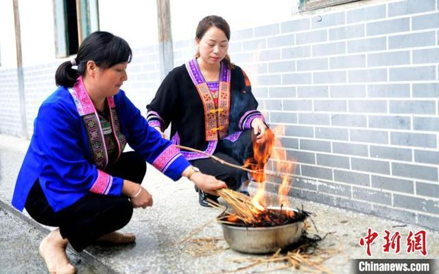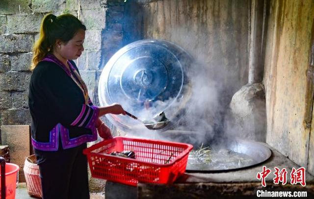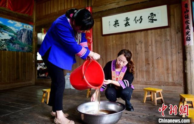 图为村民在过滤草灰水。潘志祥 摄