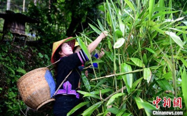 5月28日,广西桂林市龙胜各族自治县三门镇花桥村组织开展“粽叶飘香迎端午 邻里情浓话振兴”主题活动,村民们摘粽叶、烧草灰、泡糯米、包粽子、品粽子,其乐融融,喜迎端午佳节。图为村民在山上采摘粽叶。潘志祥 摄