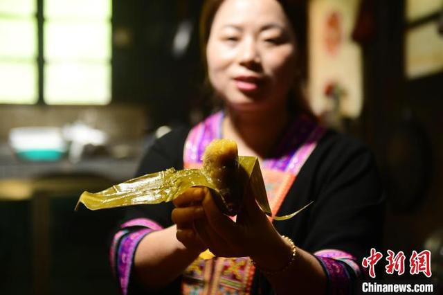 图为村民在展示刚煮熟的粽子。潘志祥 摄
