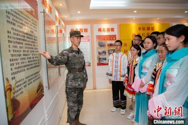 图为武警官兵为少数民族学生介绍中队荣誉室。农文尖 摄