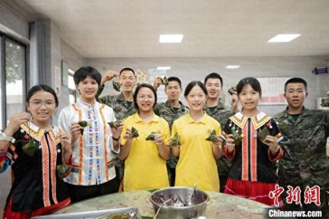 端午佳节临近,武警广西总队桂林支队军营内粽叶飘香、温情涌动。5月28日,桂林支队邀请参战老兵、学生等友邻单位代表走进军营,共同开展端午节主题活动,以红色精神传承与民族文化展示为主线,共谱军民团结、文化交融的节日篇章。图为武警官兵与少数民族学生展示所包粽子。农文尖 摄
