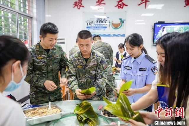 图为武警官兵与驻地友邻单位工作人员一起包粽子。农文尖 摄