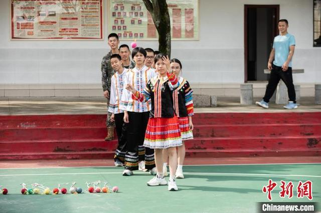 图为武警官兵与少数民族学生开展抛绣球活动。农文尖 摄