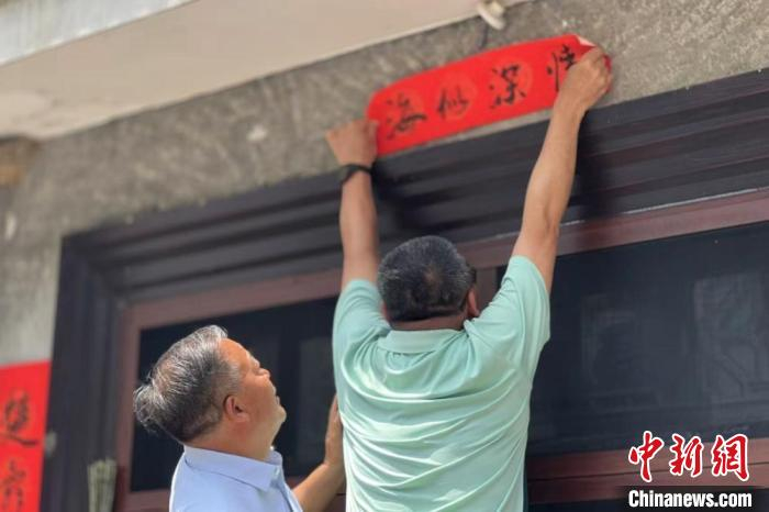 两岸屈氏后裔在屈氏宗祠门口贴对联。郭晓莹 摄万古寺村因屈原精神万古流芳而得名,相传是屈原祖籍居住地,村内居住着屈氏后裔1300多人,被称为“中华屈氏第一村”;彰化是台湾屈氏后裔聚居地,世居200多位屈氏后裔,两地屈氏后裔皆敬奉屈原为先祖。