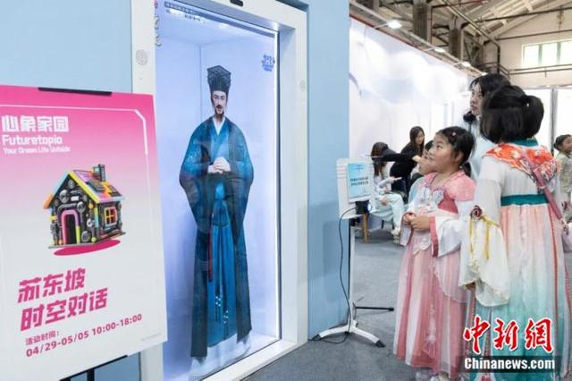 2025年4月29日,“2025梦想天堂:AI机器人酷玩乐园”在浙江杭州开园。图为小朋友体验与“苏东坡”时空对话。 中新社记者 吴君毅 摄