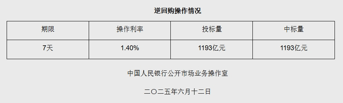 中新网6月12日电 据央行网站消息,2025年6月12日中国人民银行以固定利率、数量招标方式开展了1193亿元逆回购操作。具体情况如下: