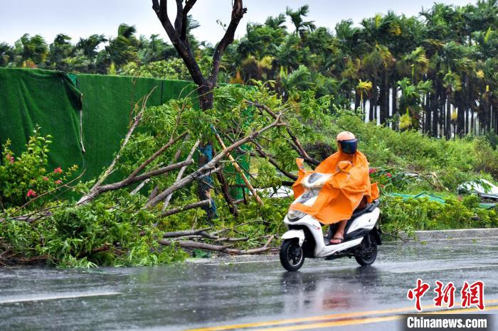 6月13日,台风“蝴蝶”带来较强风雨影响海南三亚。图为三亚市崖州湾区域居民冒雨出行,经过被台风吹倒的行道树。中新网记者 骆云飞 摄