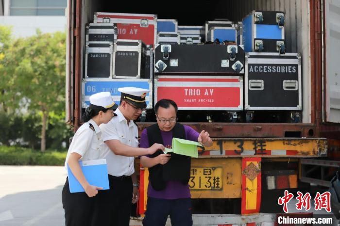 新港海关保障首批夏季达沃斯论坛物资入境。 (天津海关供图)据悉,该批物资来自新加坡,包含音响、扬声器、数字调音台等63种专业设备,共计25.9吨。