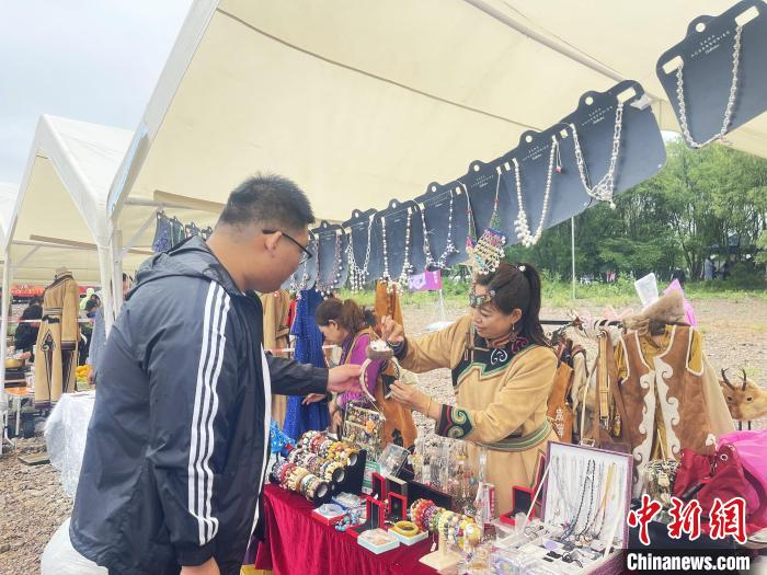 6月18日,内蒙古鄂伦春自治旗,鄂伦春妇女向游客介绍自己的手工艺品。 臧淑红 摄随着山顶的星空缓缓点亮,“穆昆达”(族长)敲着“神鼓”在鹿哨声中走上祭坛,内淑梅老人带领鄂伦春族人手持桦树皮碗,边颂唱祭文,边用柳蒿枝洒酒祭火、祭天地。