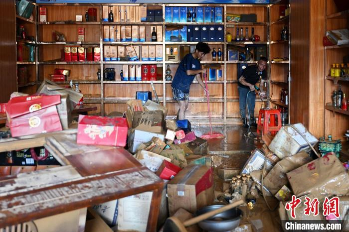 烟酒店店长古先生在擦拭着沾满黄泥的货架和墙面,他表示,此前提前接到政府的预警后,用卡车把大部分货物转移至高处,但是剩余留店货物遭浸泡。目前主要靠自己作业,志愿者也会帮忙清理门口淤泥。