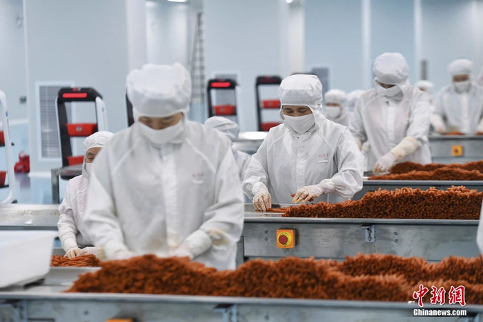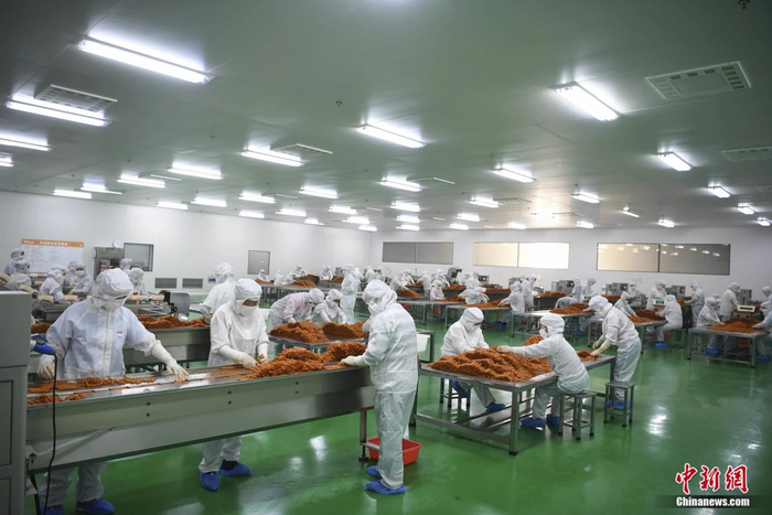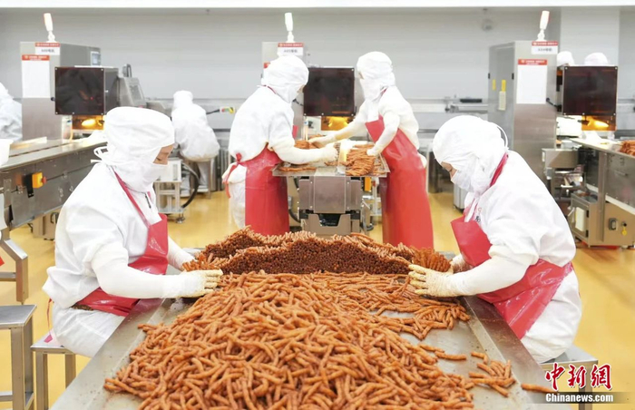工人正在现代化车间里生产辣条。麻辣王子 供图和面、挤压熟化、拌料调味……在平江县湖南麻辣王子食品有限公司制药级GMP车间里,自动化、智能化设备精准控制着湿度、温度参数和原料配比,确保辣条生产过程干净、卫生。