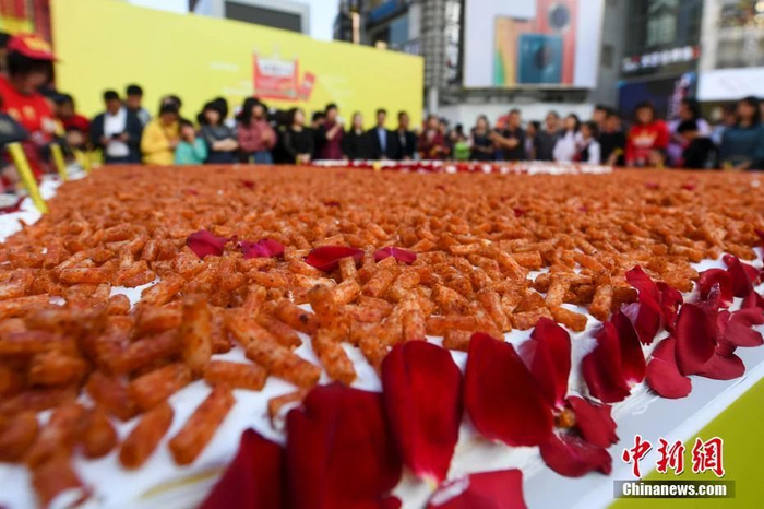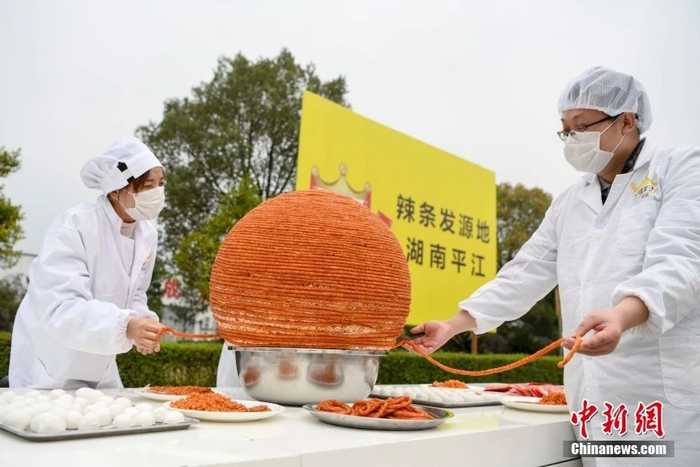 100余米的长辣条亮相株洲。杨华峰 摄平江辣条迎来高光时刻的同时,手工作坊生产、缺乏标准与监管等食品安全问题也是产业发展绕不开的痛点。辣条一度被贴上“垃圾食品”“不健康”的标签。