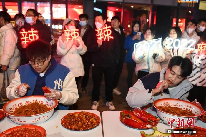 长沙一场吃辣跨年活动吸引民众参与。杨华峰 摄湘人餐桌上,混入鲜红剁椒的种种食材火辣鲜香;拌好的牛肉干、牛板筋、鸡翅尖、海带、萝卜条等各式小食浸润着亮晶晶的红油,一口下去鲜香无比,辛辣滋味瞬间萦绕口腔。