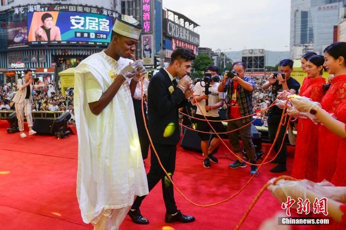 外国人挑战吃辣条。杨华峰 摄借助社交媒体和不断开拓的消费新场景,辣条“混”进了年轻人婚礼,特制的5.2米长的辣条用来“考验”新郎和伴郎团,并与电竞、音乐节、动漫展等场景结合,让更多年轻人爱上辣条。