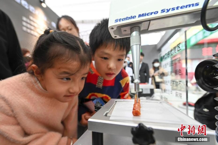 辣条博物馆里,小朋友观察辣条的韧性测试。杨华峰 摄尤其是博物馆现场展示的迷你辣条生产设备及辣条GMP洁净生产车间实时投屏,让参观者在惊叹于辣条生产智能化蜕变的同时,也对辣条产业的品质升级有了全新认知,为辣条进一步正名。