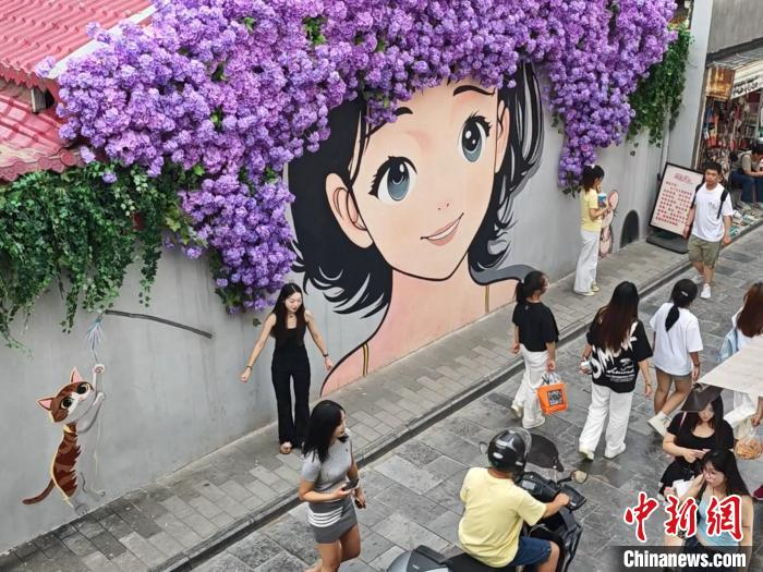 图为民众在西安老菜场文化创意街区的涂鸦墙前拍照。党田野 摄位于西安城墙建国门附近的老菜场文化创意街区(简称:老菜场街区),前身是西安市平绒厂,后被改建成了一个售卖肉类、蔬菜瓜果等商品的综合市场,老街坊们把它称为“老菜场”。近年来,经过不断地“城市更新”,这栋老建筑逐渐焕发出“新活力”。来西安城墙下“逛老菜场”,已成为不少年轻人和游客的热门选择。