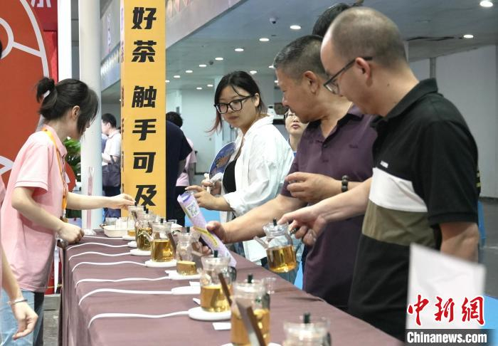 图为参观者在一参展企业展台前品尝茶饮。 景诗雁 摄