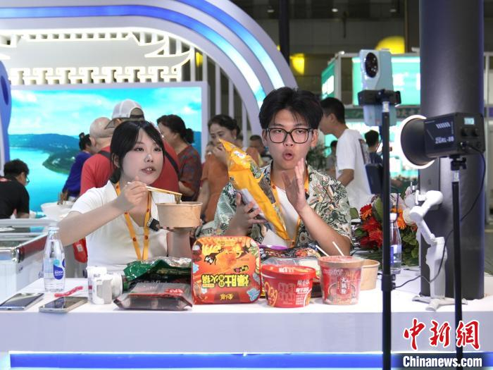 图为参展企业在博览会现场直播带货。 景诗雁 摄