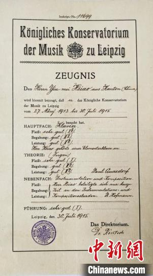 《国立音乐专科学校校舍落成纪念特刊》。孙中山大元帅府纪念馆 供图此次展览还展出1915年德国莱比锡音乐学院颁发给萧友梅的毕业文凭(复制件)。据介绍,1912年底,萧友梅赴德国柏林学习德语,后转至莱比锡音乐学院深造,主修钢琴和作曲理论。该毕业文凭原件藏于上海音乐学院,是萧友梅留学生涯的重要物证。(完)