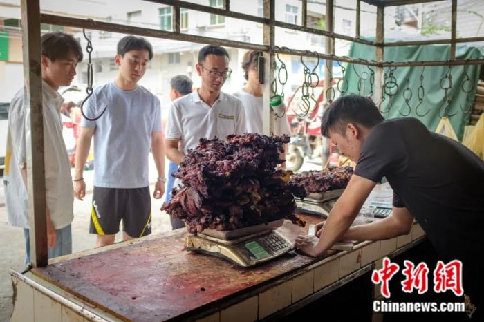 游客购买丰阳牛肉干。 丰阳镇人民政府 供图2024年7月,香港36名青年组成“香港青年游走网上农村考察团”,专程来到丰阳镇,现场观摩丰阳牛肉干的烤制过程,在柴火气息与肉香交织的体验中,通过直播带货将丰阳牛肉干推广香港、深圳等地,吸引了大批“粉丝”。