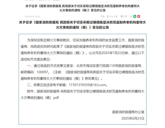中新网6月24日电 据中国消防微信公众号消息,为深刻汲取近期火灾事故教训,切实加强养老机构消防安全监管工作,国家消防救援局、民政部共同研究起草了《国家消防救援局民政部关于切实采取过硬措施坚决防范遏制养老机构重特大火灾事故的通知(稿)》。公众可在2025年7月23日前,通过以下途径和方式提出意见: