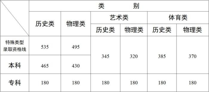 云南省2025年高考录取分数线公布。云南省招生考试院 供图本科批次艺术类中,历史类345分,物理类320分;体育类中,历史类385分,物理类370分。特殊类型录取资格线历史类535分,物理类495分(特殊类型录取资格线用于强基计划、高校专项计划、军队院校招生等特殊类型招生)。专科分数线为180分。