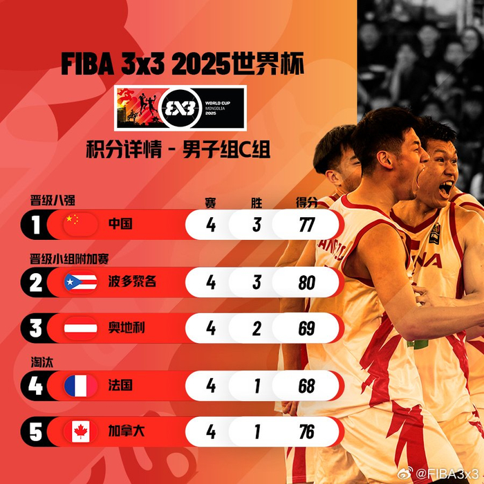 图片来源:FIBA3x3社交媒体艰难赢下这场强强对话,加上此前接连击败劲旅波多黎各队与加拿大队,中国队的小组赛战绩定格为三胜一负,位居C组第一,直接晋级八强。波多黎各队、奥地利队将与其他小组的二、三名竞争八强席位。