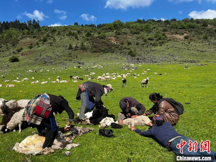 阿木姐弟(右二、右三)加入到剪羊毛的队伍。时文枝 摄都快十点了,太阳才缓缓爬上东边的雅拉山的山梁。太阳一出,海拔3600多米的星沾牧场顿时生动起来。远处的群山披着浓重厚实的深绿,脚下的草场铺满光影斑斓的新绿,各色野花和黑牛白羊点缀其间,好似一幅安详宁静的油画。