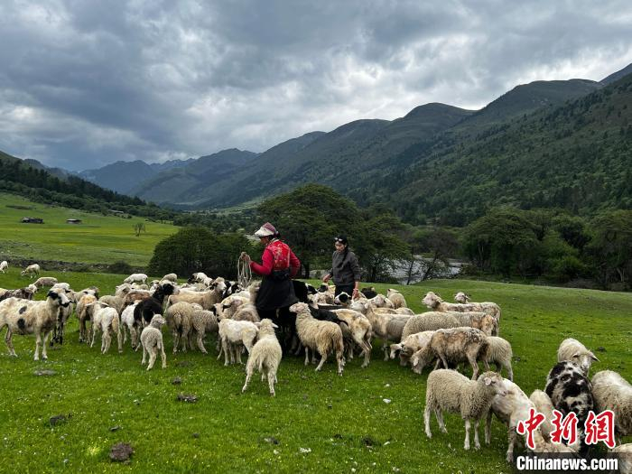 央宗措姆与妈妈七林央宗在星沾牧场照看绵羊。 时文枝 摄爸爸丹增培楚在老家尼汝村种青稞,打零工,妈妈七林央宗常年奔走在尼汝村的冬夏牧场,弟弟扎西定主在昆明打工,今年春天才回到爸妈身边。而央宗措姆自己,小家安在香格里拉市,旅游旺季即将来临,在一家旅拍店工作的她马上就要开始忙活了。所以昨天抽空牵着马,走了整整一天的山路,才将女儿带回来,要请外公外婆帮忙看管两三个月。