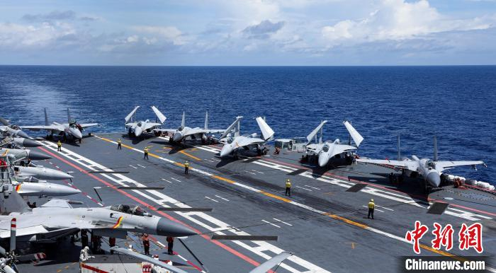 近日,海军辽宁舰、山东舰航母编队组织远海实战化训练。图为山东舰甲板舰载机布列。王健 摄训练期间,外军舰机多次抵近侦察、跟踪监视,编队全程保持高度戒备、随时反应的作战状态,多次组织舰载机战斗起飞,专业稳妥处置应对。