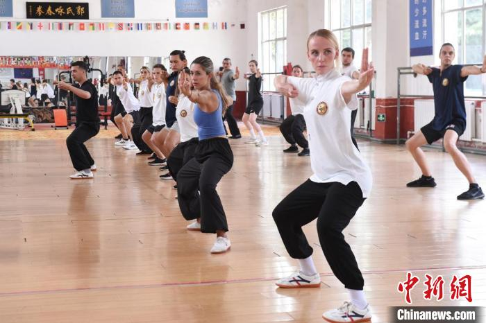 2025年6月,山东烟台,那塔丽与来自各国的同学一起学功夫。曲正扬 摄今年4月,那塔丽来到中国,正式开启学武之旅。在武校,她每日与来自不同国家、不同年龄的学员一同站桩、踢腿,从摊手、膀手等基础动作学起。教练现场示范“小念头”套路时,她仔细观察动作要领,有时还用手机录制视频反复研究。