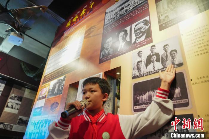 6月23日,昆明市西山区侨光小学的学生讲解员在校史馆向同学讲述南侨机工历史。 中新社记者 刘冉阳 摄这段历史也成为侨光小学联结海内外侨胞、教育界的桥梁。