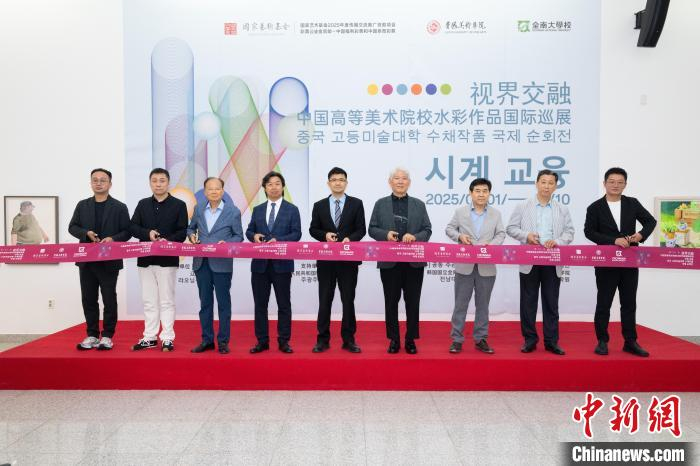 7月1日,“视界交融——中国高等美术院校水彩作品国际巡展”在韩国光州广域市开幕。图为开幕式现场。中国驻光州总领事馆 供图周积华致辞表示,巡展展现了中国当代水彩艺术的独特魅力与深厚底蕴。中韩文缘相通,韩国湖南地区系著名“艺乡”,期待双方以艺术为媒,不断深化人文交流、增进民心相通,携手绘就美美与共的文明新画卷。
