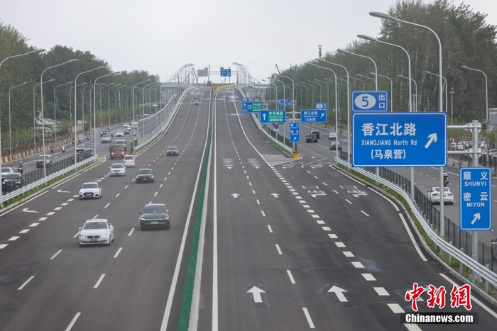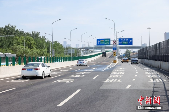 7月5日,京密路(太阳宫北街-机场南线)道路工程完工通车,这是继机场高速、京承高速之后,北京又增添一条东北方向的交通大动脉。通车后将进一步提升沿线区域交通服务水平,助力北京国际交往中心建设,为首都机场、新国展提供交通保障。中新社记者 贾天勇 摄