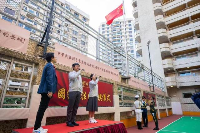 穆家骏(左)与学生参加学校升国旗仪式。(受访者供图)作为教育工作者,穆家骏表示,将持续挖掘香港本土爱国主义教育资源,强化网络教育阵地建设,通过创新形式将全民族抗战历史传递给广大香港青少年。