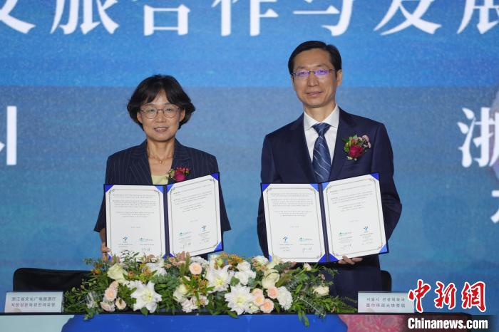 7月8日,“山海相契又见江南”诗画浙江(韩国)文旅推介会在韩国首尔举行。图为文旅合作备忘录签约。中新网记者 刘旭 摄随后,陈如福与首尔市政府观光体育局副局长权明姬代表双方签署文旅合作备忘录,以加强双方在旅游资源互推、客源市场共享、节庆活动联动、文旅人才交流等方面的深度合作。