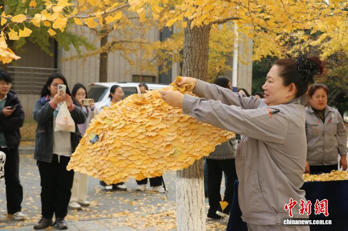 保洁阿姨用树叶装点校园。大连外国语大学供图“往年的银杏叶落了就直接扫走,总觉得怪可惜的。”谈及创作初衷,保洁阿姨项福兰说道。在日常打扫时,阿姨们便萌生了“废物利用”的想法:“既然迟早要清理,不如把它们摆成好看的模样,给校园添点不一样的精彩,也给师生们多一份情绪价值。”